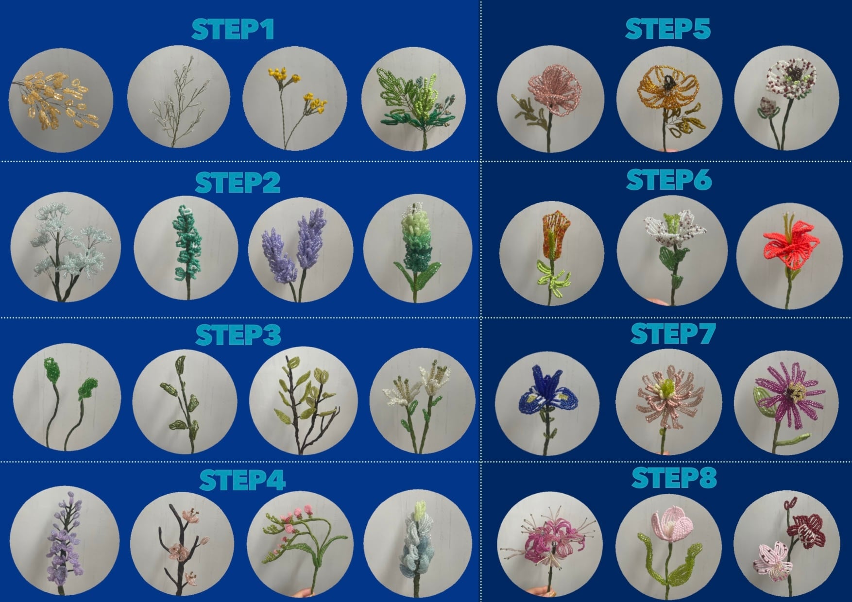 基礎から応用まで、全8ステップをご用意。各ステップの中から、あなたの「作ってみたい!」と思うお好きなビーズフラワーを選んでレッスンを進められます。