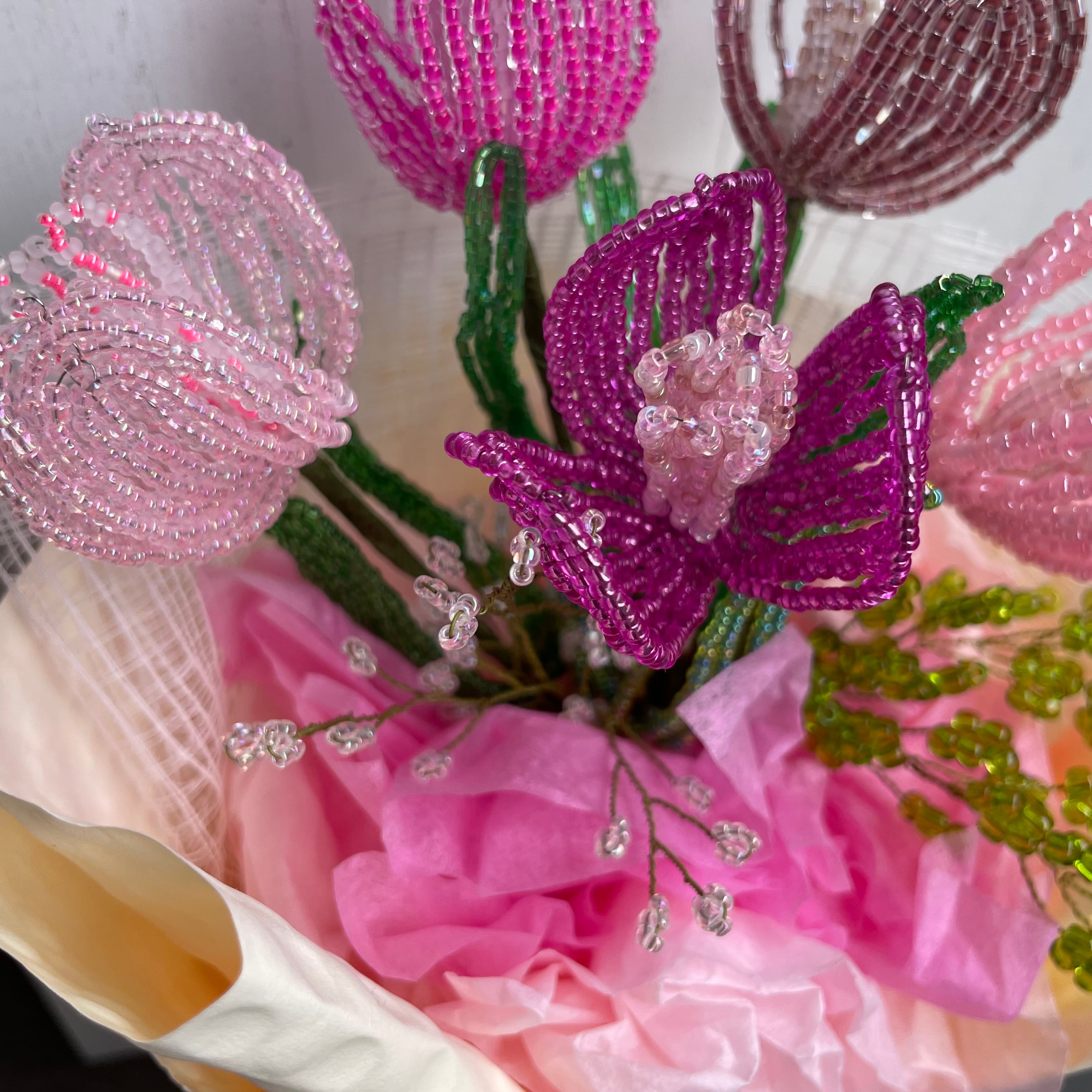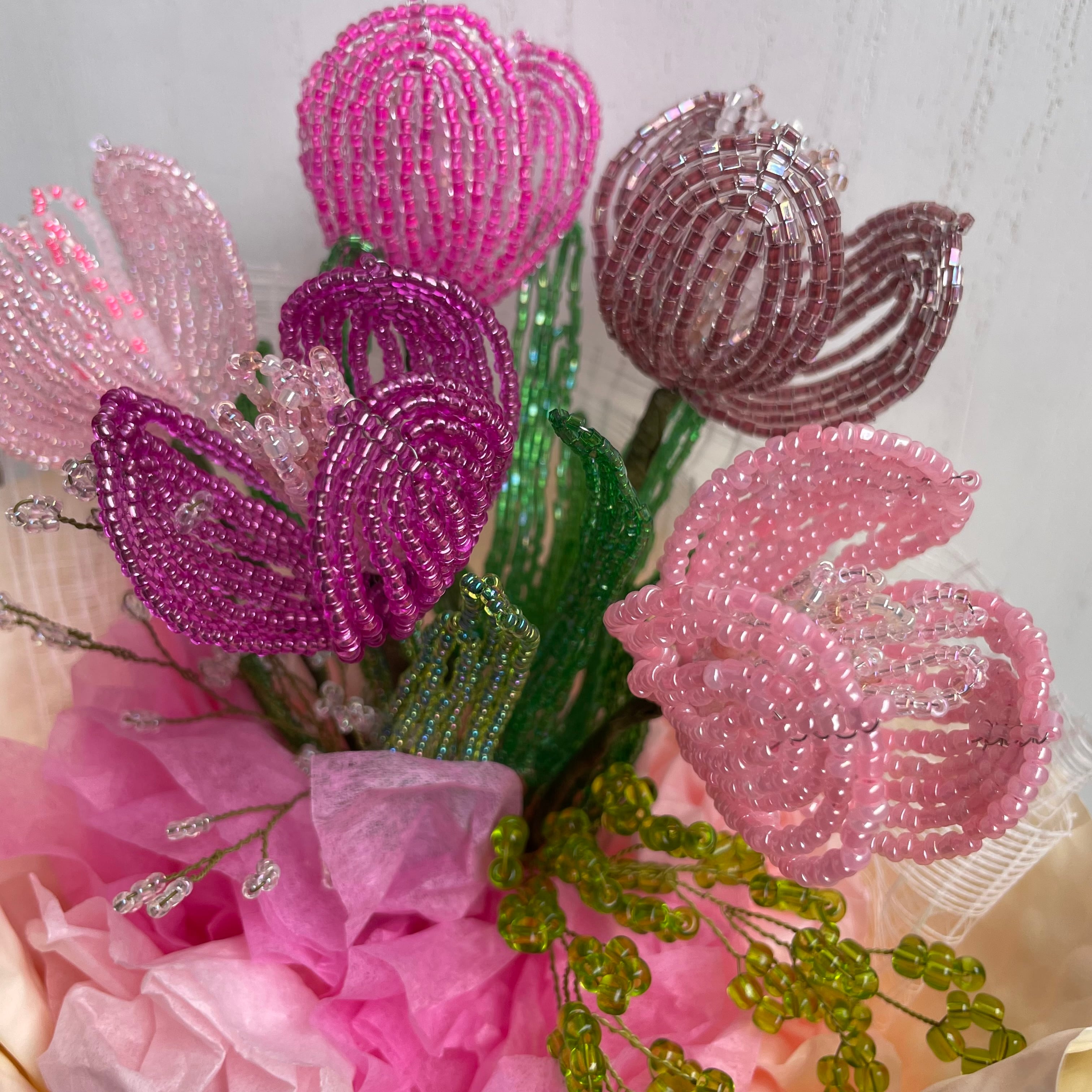 母の日の贈り物や、毎日頑張る自分へのご褒美に。 一粒一粒、糸とワイヤーで編み上げた「ビーズフラワー」をお届けします。 Point • 水やり不要で、ずっと綺麗なまま。 • 光を反射する、ガラスビーズ特有の透明感。 • 生花にはない、アンティークのような佇まい。 あなたの日常が、優しく輝き始めますように。